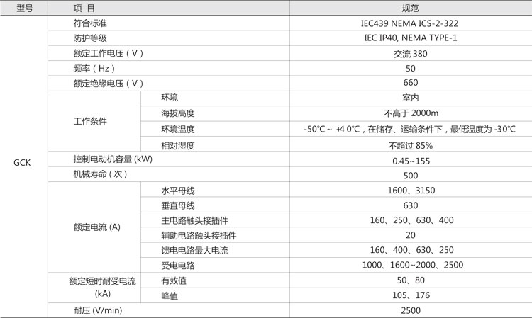 GCK低壓抽出式開關柜,主要是由一些組合式電動機控制單元,和其它功能單元組合而成。這些單元以上下重疊的方式安裝在封閉的金屬柜體內。用設置在柜體上方的水平母線,將每個柜體聯結在一起,同一柜體的功能單元則并聯在垂直母線上。柜體共分水平母線區、垂直母線區、電纜區和設備安裝區等四個互相隔離區域,功能單元分別安裝在各自的小室內,當任何一個功能單元發生事故時,均不影響其它單元,防止事故擴大。本產品符合JB/T9661-1999標準。該產品采用IEC114規定的IP40防護等級,當所有的門和護板關閉時,或門開啟時以及功能單元外于移出位置時,均能達到相應的防護等級,這樣可確保人身安全。該產品設置有完善可靠的接地系統和保護電路,所有功能單元均能按規定的性能要求,分斷短路電流,進線單元具有三段保護特性。因此,可以保證供電的可靠性,和設備與系統的安全。所有功能單元,均可通過接口件與PC線板(可編程序控制器)或微處理機連結,作為自動控制系統的執行單元,根據用戶需要還可以提供其它內容的功能單元和功能組合,該產品適用于交流380V,頻率50Hz的電路中。